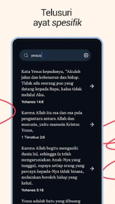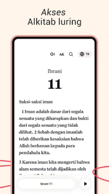 Selain keupayaannya untuk digunakan di luar talian, Aplikasi Alkitab Lite melengkapkan anda dengan pelbagai ciri yang memperkaya. Anda boleh menandakan dan menyimpan ayat-ayat kesukaan anda untuk rujukan masa depan, memastikan pelajaran anda sentiasa diingati. Mulakan hari anda dengan inspirasi harian melalui "Ayat Hari Ini", dan luangkan masa peribadi dengan Tuhan melalui fungsi "Doa Harian". Bagi mereka yang suka mendengar, tersedia juga Alkitab audio untuk setiap bab NIV, dan anda boleh menikmati "Cerita Alkitab Audio" yang memikat di mana sahaja, bila-bila masa (memerlukan internet untuk audio). Aplikasi ini juga memudahkan anda untuk berkongsi ayat-ayat Alkitab yang penuh semangat dengan rakan dan keluarga melalui imej yang indah.