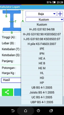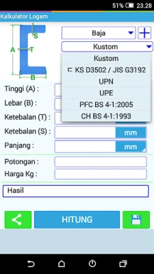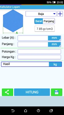 Kalkulator Berat Logam: Kira berat logam dengan pantas dan mudah. Aplikasi ini juga membolehkan anda menentukan panjang logam berdasarkan berat yang diberikan. Cepat, ringkas, dan tepat untuk keperluan pengiraan anda.