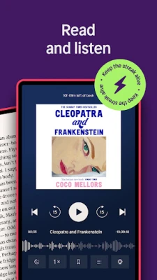 Pembaca buku elektronik Nextory direka untuk keselesaan optimum anda. Sesuaikan saiz fon, kecerahan skrin, dan warna latar belakang mengikut preferensi peribadi atau persekitaran bacaan anda. Penanda halaman automatik dan fungsi penanda memudahkan anda menyambung semula bacaan dari tempat terakhir anda berhenti, atau kembali ke bab kegemaran dengan mudah. Bagi pengguna tablet, pengalaman paparan dwi-halaman menyerupai keselesaan membaca buku fizikal. Sementara itu, pemain buku audio Nextory menawarkan kawalan penuh, membolehkan anda melaraskan kelajuan penceritaan, melangkau ke hadapan atau ke belakang, malah menetapkan pemasa tidur. Anda juga boleh menjejaki kemajuan pendengaran anda dan terus menikmati cerita walaupun dalam mod penjimatan tenaga.